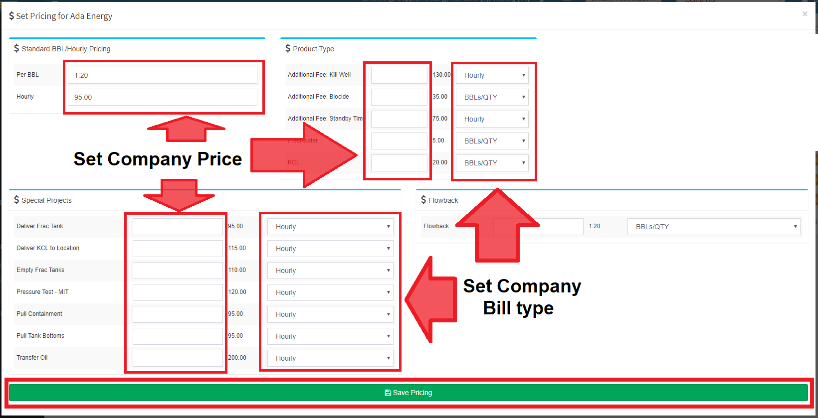 Enter value for each Job Type price and set the Bill type (BBL or Hourly).