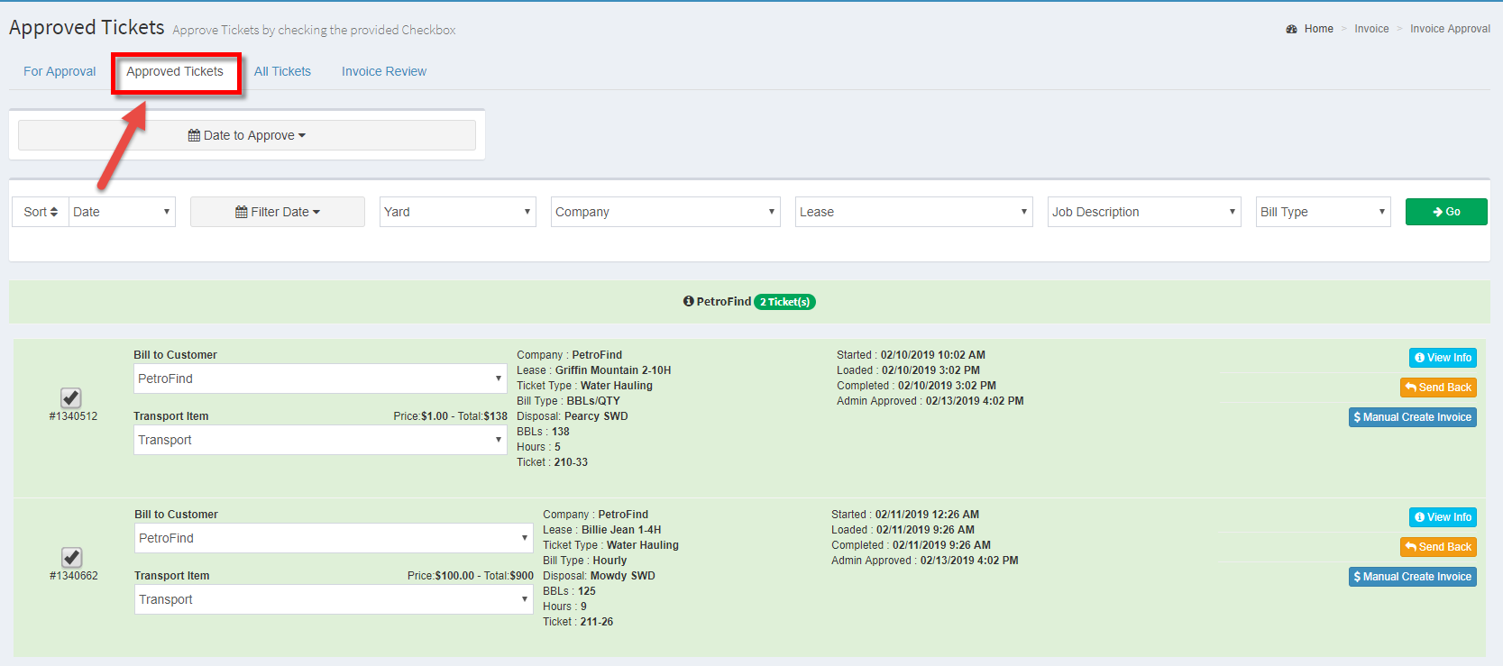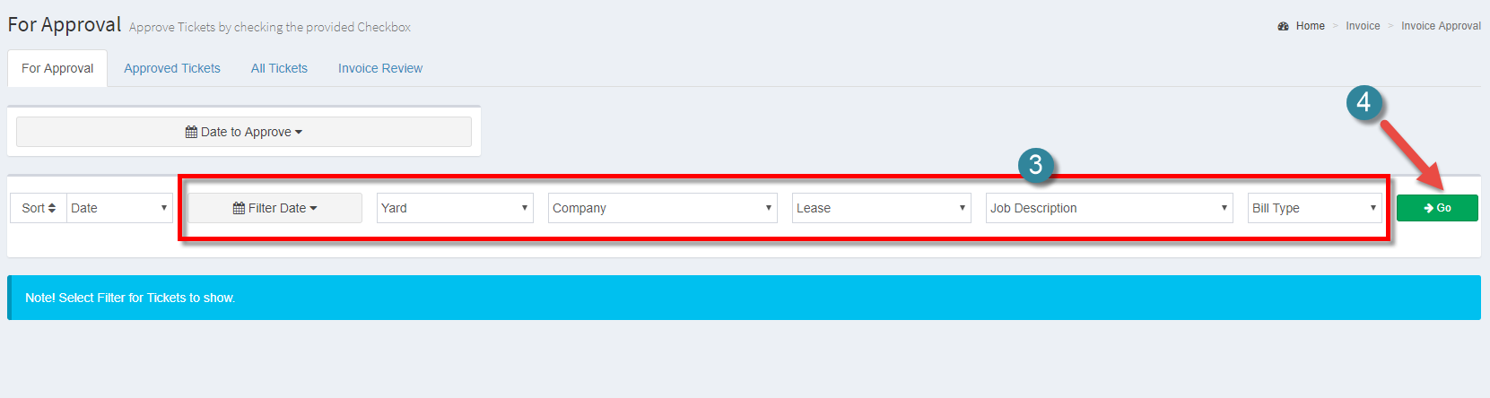 3. Use the filters at the top of the page to view the desired tickets. You can filter by Date, Yard, Company, Lease, Job Description, and Bill Type. If you want to see all tickets ready for Invoice Approval, you can skip this step.