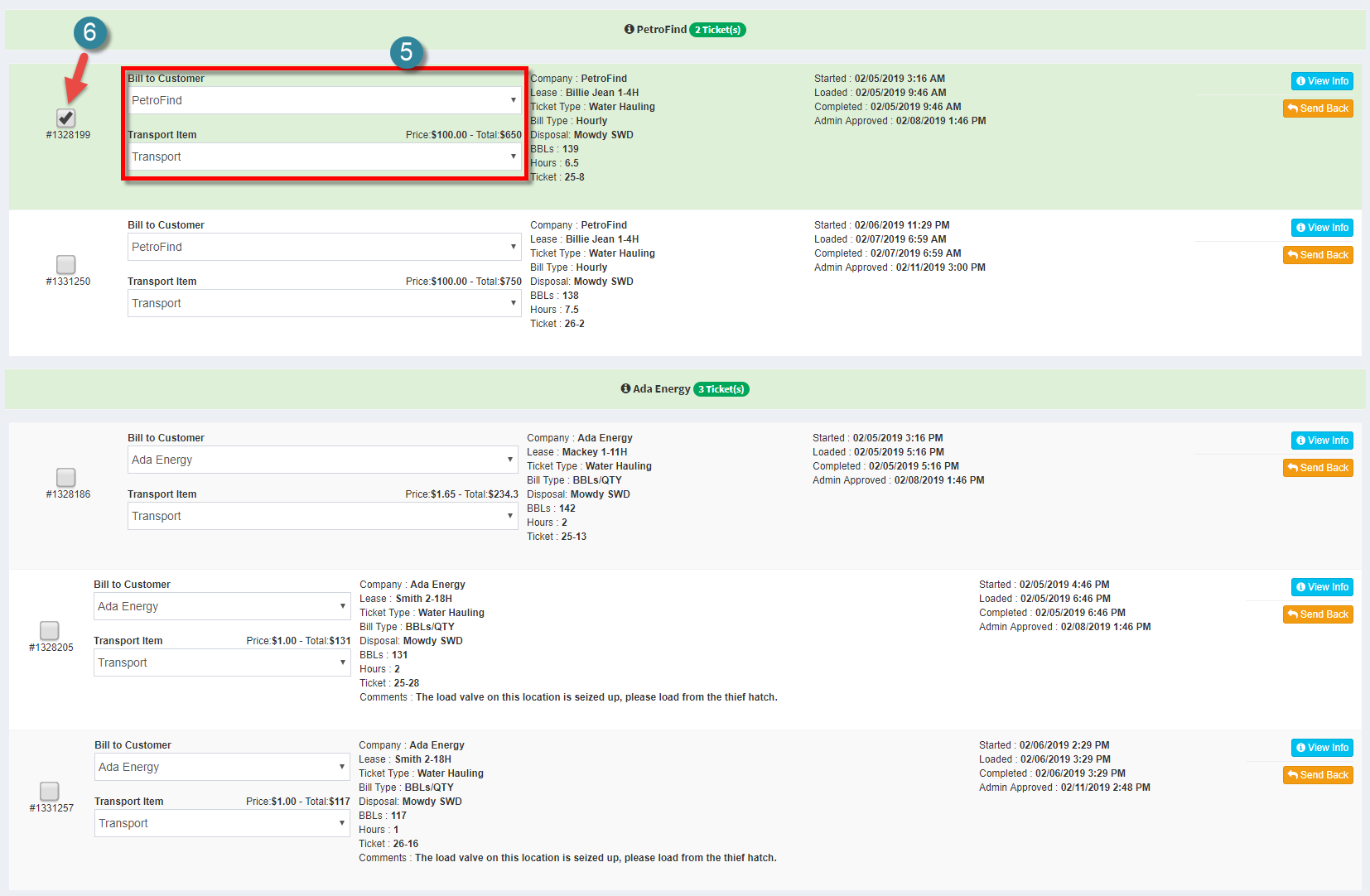 6. Once you verify that the billing information is correct, you can approve the ticket by clicking the check box on the left: