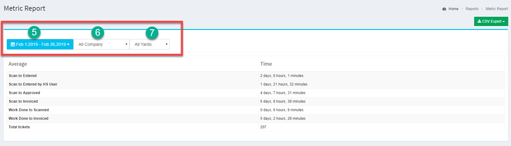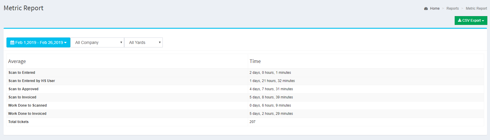 | Scan to Invoiced | The averaged amount of time elapsed from tickets being Scanned to Invoiced |