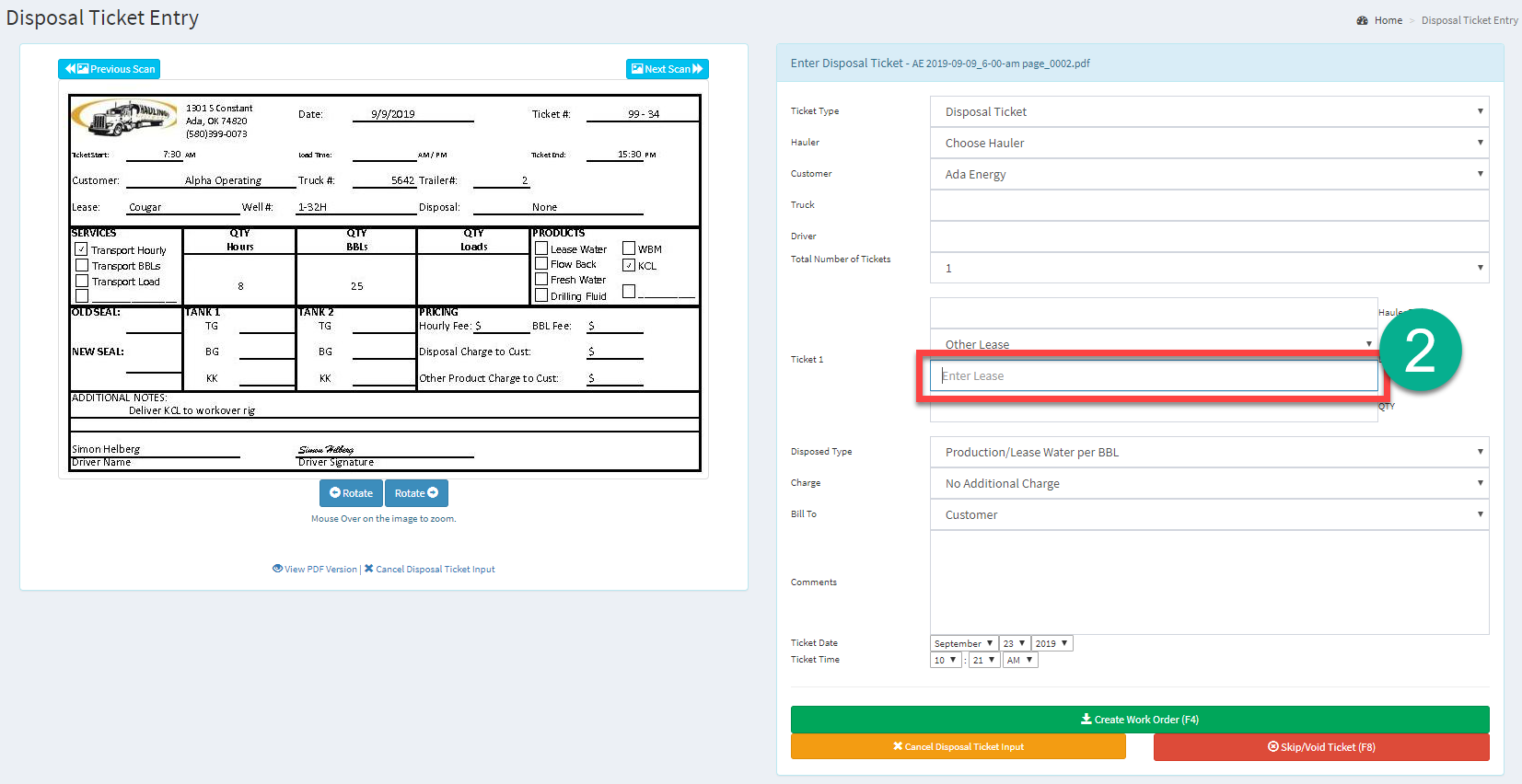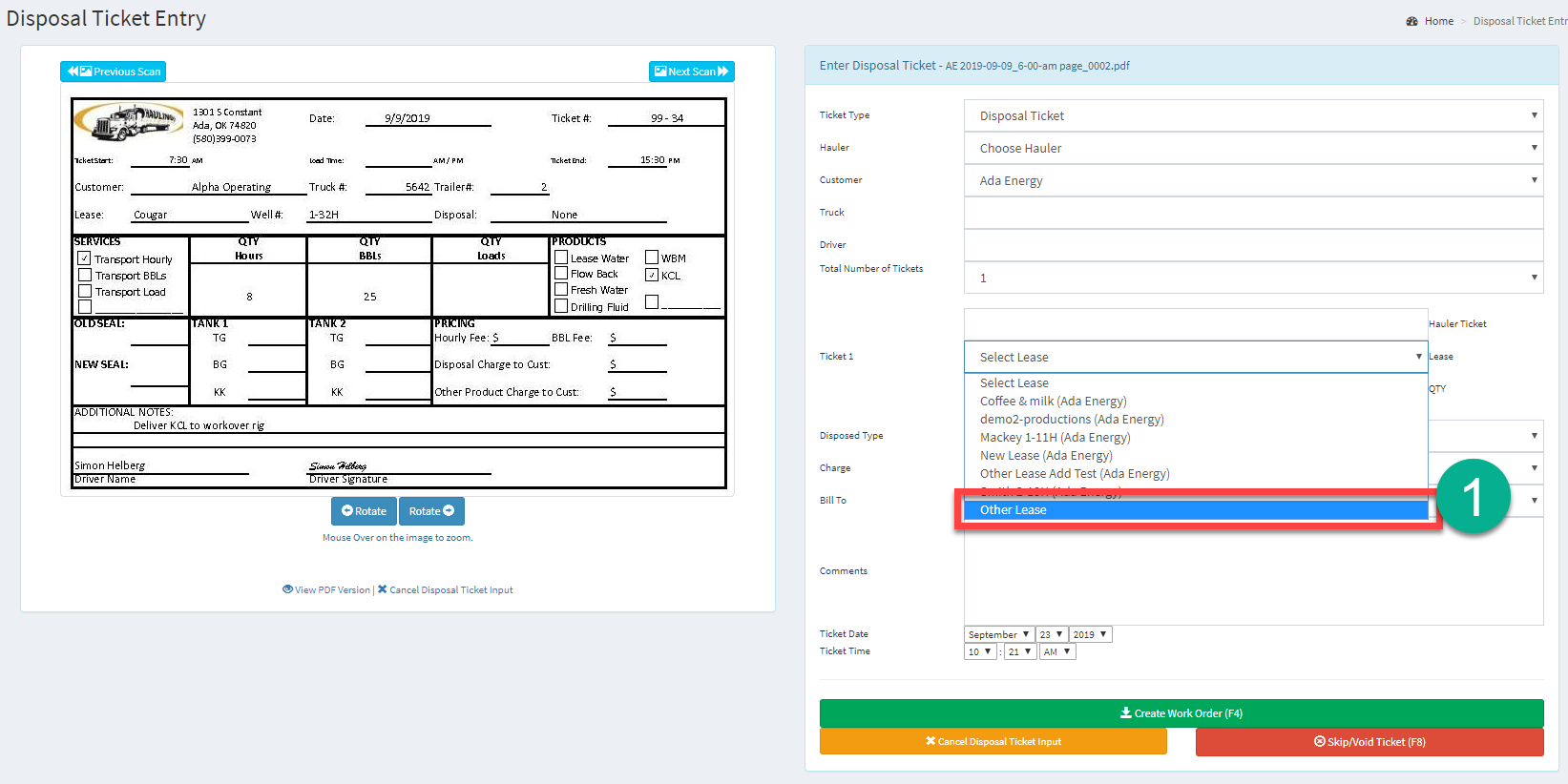 1. From the ticket entry page, choose the correct customer. Once the customer is selected, you can then browse the Lease Drop-down. If the lease is not in the drop-down list, you can select Other Lease: